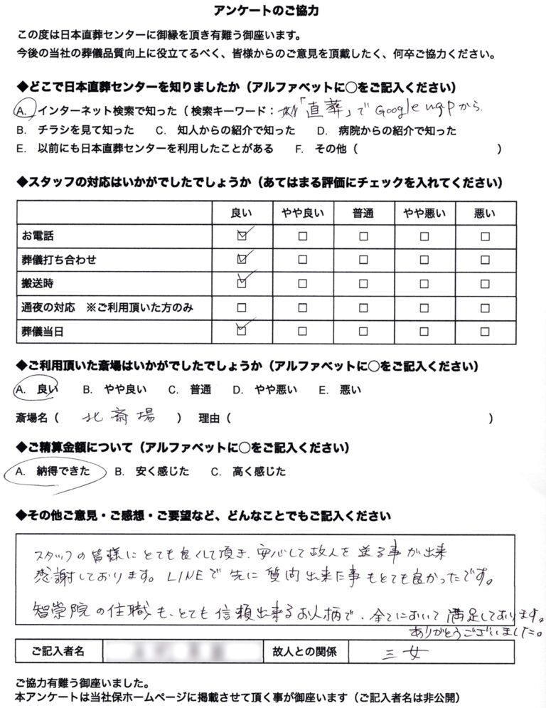 わからない事だらけなのと主人を失ってしまったショックで、ほとんどお任せしてしまいましたが大変心のこもった葬儀が出来て満足しています。 自分の時も日本直葬センターさんにお願いしようと思っています。
